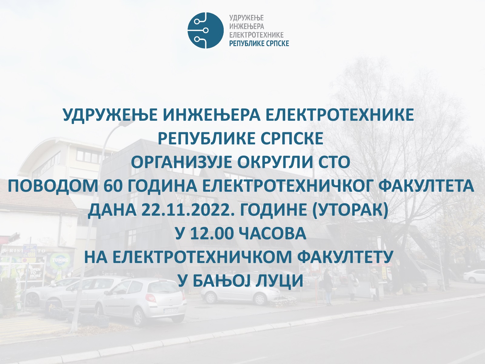 Udruženje inženjera elektrotehnike Republike Srpske organizuje okrugli sto povodom 60 godina Elektrotehničkog fakulteta u Banjoj Luci, dana 22.11.2022. (utorak) s početkom u 12.00 časova u prostorijama Elektrotehničkog fakulteta.